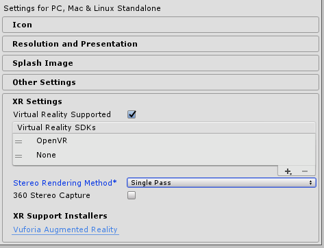 My biggest tip for anyone starting a VR project would be – turn this option on and leave it on! If something breaks with it (usually objects don’t look right or only show in one eye) track down the problem and fix it or use something different. It’s very tempting to turn it off temporarily, but in my experience once you’ve done that it’s very difficult to turn it back on again.