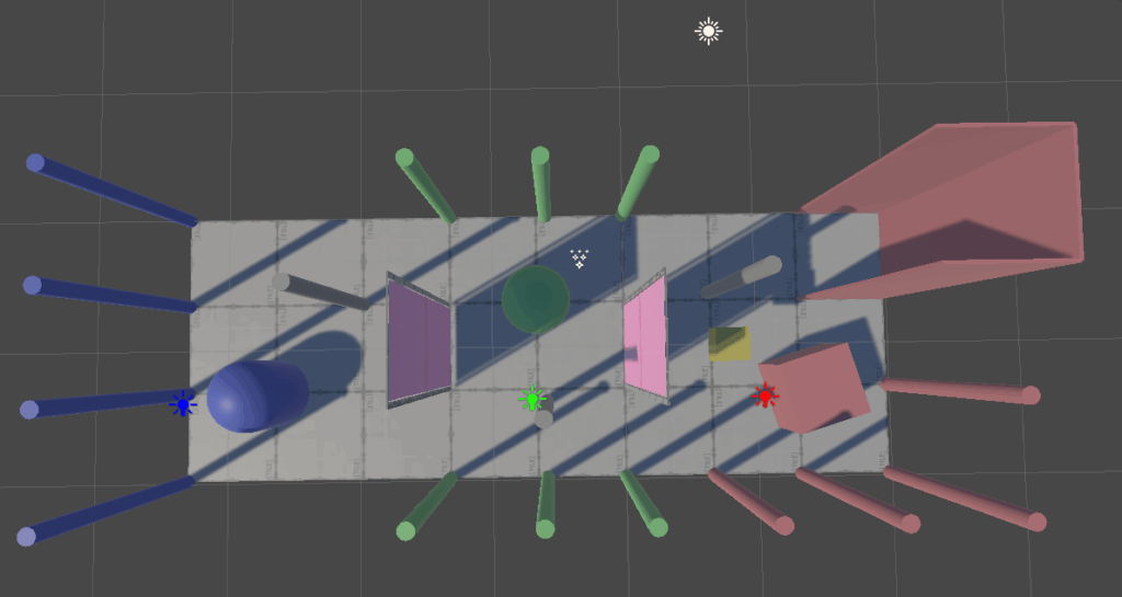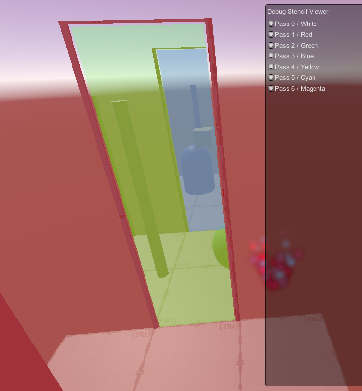 At this point, it’s just a case of setting the sector’s materials to test against the stencil buffer so that they only draw where each colour says they should be using the read mask. The exact details are a bit tedious, but if you’re interested then Ronja Böhringer has a pretty good description of the various bits of shader syntax in action.